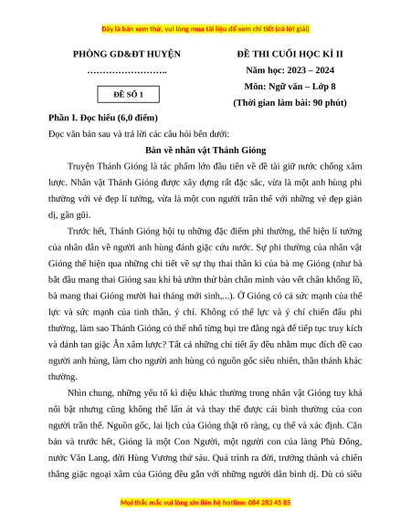 Môn: Ngữ văn – Lớp 8 ĐỀ SỐ 1