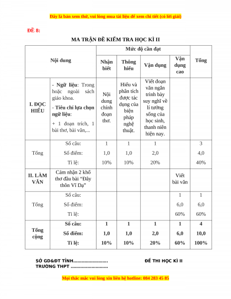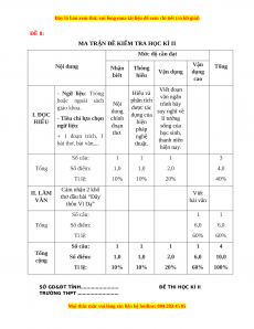 - Tiêu chí lựa chọn chính lí tưởng HIỂU biện ngữ liệu: đoạn sống của pháp thơ. học sinh, + 1 đoạn trích, 1 nghệ thanh niên bài thơ, bài văn,... thuật. hiện nay. Số câu: 1 1 1 3 Tổng Số điểm: 1,0 1,0 2,0 4,0 Tỉ lệ: 10% 10% 20% 40% Cảm nhận 2 khổ II. LÀM Viết thơ đầu bài “Đây VĂN bài văn thôn Vĩ Dạ” Số câu: 1 1 Tổng Số điểm: 6,0 6,0 Tỉ lệ: 60% 60% Số câu: 1 1 1 1 4 Tổng Số điểm: 1,0 1,0 2,0 6,0 10,0 cộng Tỉ lệ: 10% 10% 20% 60% 100%