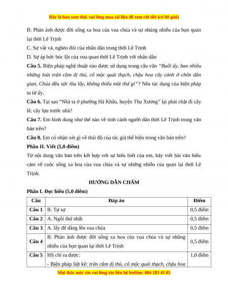 cảm về cuộc sống xa hoa của vua chúa và sự những nhiễu của quan lại thời Lê Trịnh. HƯỚNG DẪN CHẤM