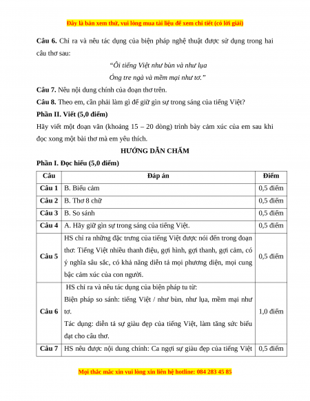 Phần I. Đọc hiểu (5,0 điểm) Câu Đáp án Điểm Câu 1 B. Biểu cảm 0,5 điểm Câu 2 B. Thơ 8 chữ 0,5 điểm Câu 3 B. So sánh 0,5 điểm