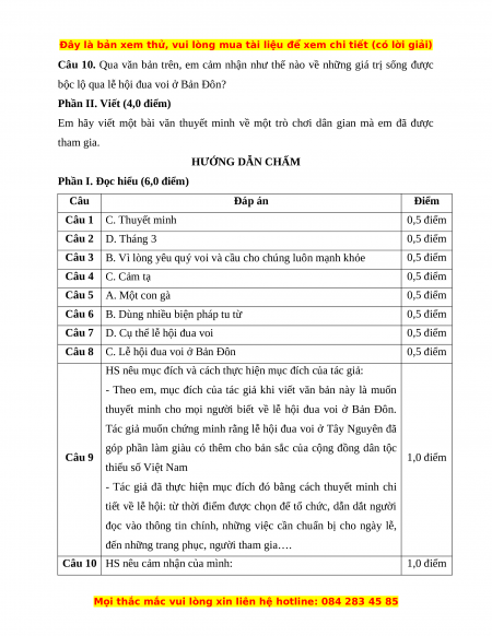 Phần I. Đọc hiểu (6,0 điểm) Câu Đáp án Điểm Câu 1 C. Thuyết minh 0,5 điểm Câu 2 D. Tháng 3 0,5 điểm
