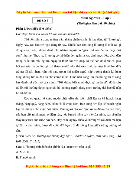 Môn: Ngữ văn – Lớp 7 ĐỀ SỐ 3