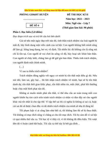 Môn: Ngữ văn – Lớp 7 ĐỀ SỐ 4