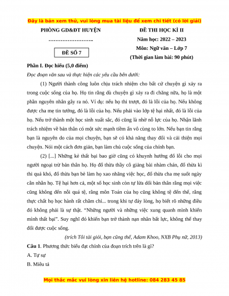 Môn: Ngữ văn – Lớp 7 ĐỀ SỐ 7
