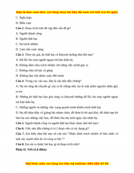 Câu 2. Đoạn trích trên đề cập đến vấn đề gì? A. Người thành công B. Người thất bại C. Sự trách nhiệm D. Làm chủ cuộc sống
