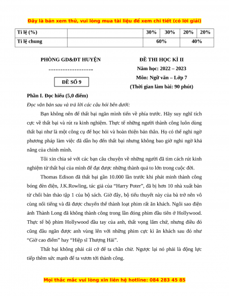 Môn: Ngữ văn – Lớp 7 ĐỀ SỐ 9