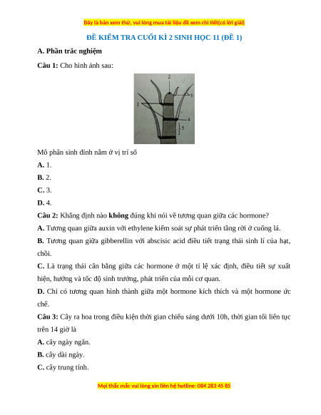 ĐỀ KIỂM TRA CUỐI KÌ 2 SINH HỌC 11 (ĐỀ 1)
