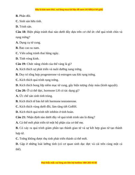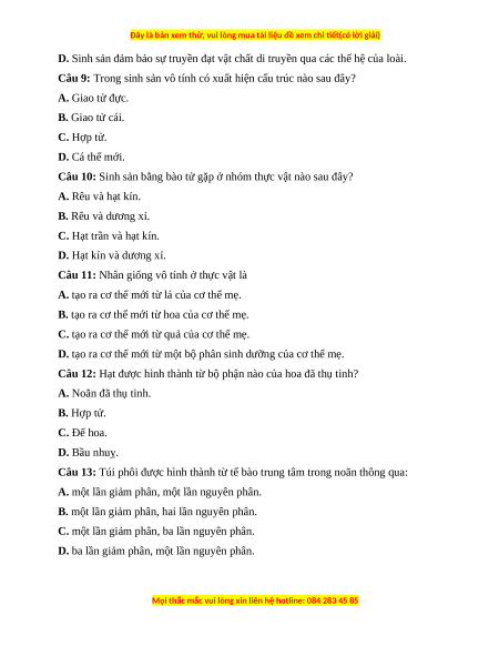 Câu 9: Trong sinh sản vô tính có xuất hiện cấu trúc nào sau đây? A. Giao tử đực. B. Giao tử cái. C. Hợp tử. D. Cá thể mới.