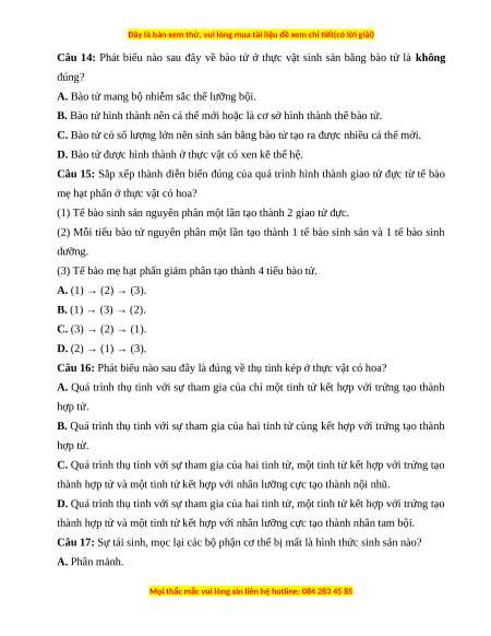 Câu 16: Phát biểu nào sau đây là đúng về thụ tinh kép ở thực vật có hoa?