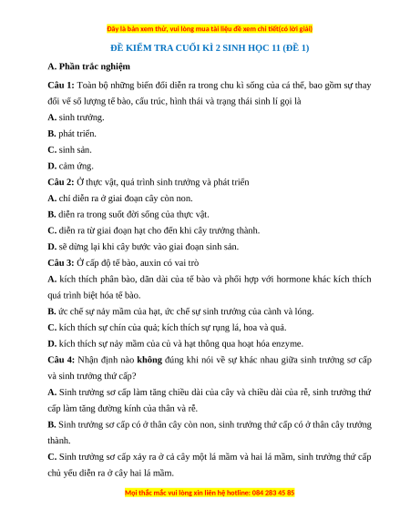 ĐỀ KIỂM TRA CUỐI KÌ 2 SINH HỌC 11 (ĐỀ 1)