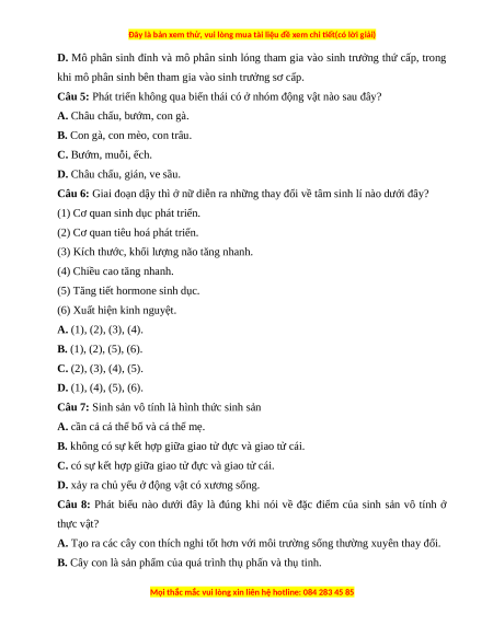 Câu 9: Hình thức sinh sản nào dưới đây thuộc hình thức sinh sản hữu tính ở động vật? A. Phân đôi. B. Đẻ trứng. C. Nảy chồi. D. Trinh sinh.