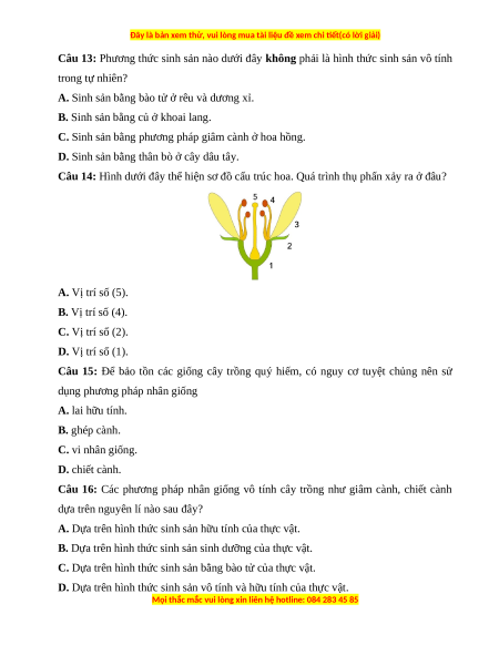 Câu 14: Hình dưới đây thể hiện sơ đồ cấu trúc hoa. Quá trình thụ phấn xảy ra ở đâu? A. Vị trí số (5). B. Vị trí số (4). C. Vị trí số (2). D. Vị trí số (1).