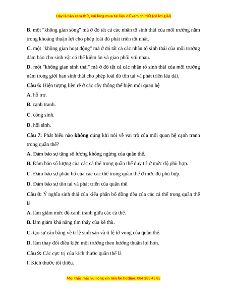 Câu 6: Hiện tượng liền rễ ở các cây thông thể hiện mối quan hệ A. hỗ trợ. B. cạnh tranh. C. cộng sinh. D. hội sinh.