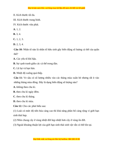 IV. Kích thước vừa phải. A. 1, 2. B. 3, 4. C. 1, 2, 3. D. 2, 3, 4.