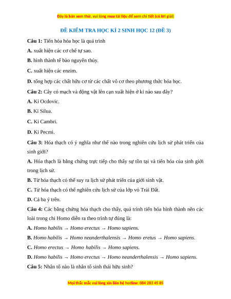 ĐỀ KIỂM TRA HỌC KÌ 2 SINH HỌC 12 (ĐỀ 3)
