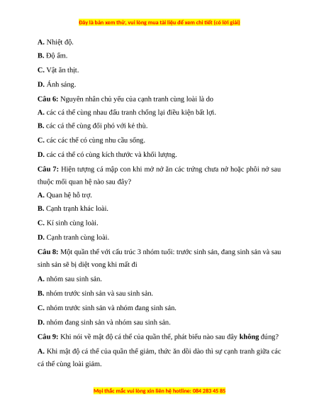 Câu 6: Nguyên nhân chủ yếu của cạnh tranh cùng loài là do