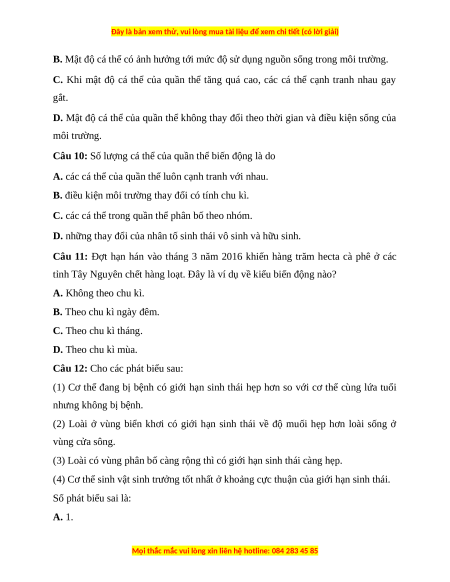 Câu 9: Khi nói về mật độ cá thể của quần thể, phát biểu nào sau đây không đúng?