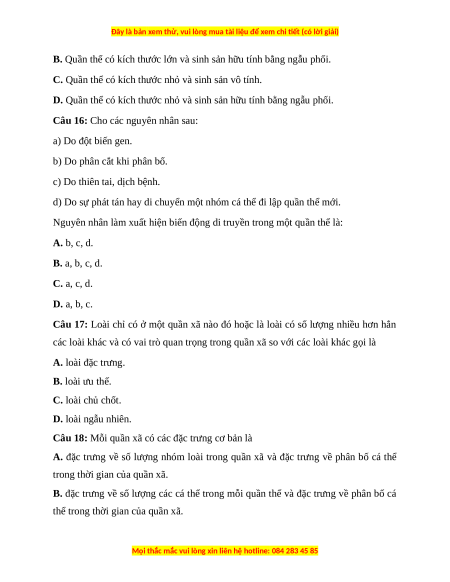 Câu 8: Một quần thể với cấu trúc 3 nhóm tuổi: trước sinh sản, đang sinh sản và sau