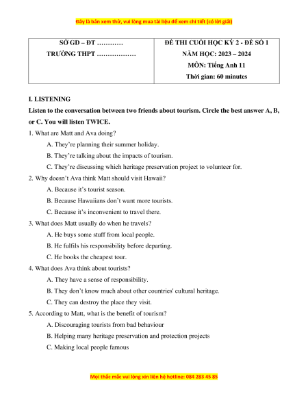 Đề thi cuối kì 2 Tiếng Anh 11 Global success (Đề 1 kèm file nghe)
