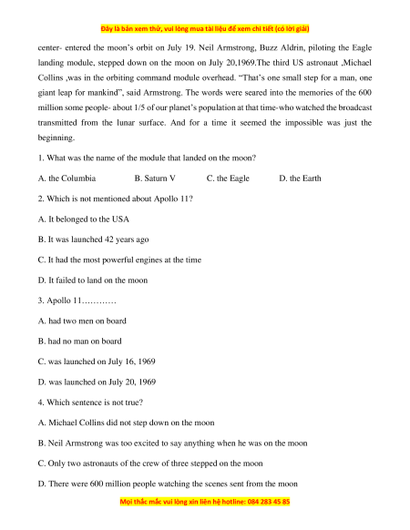 D. It failed to land on the moon 3. Apollo 11………… A. had two men on board B. had no man on board