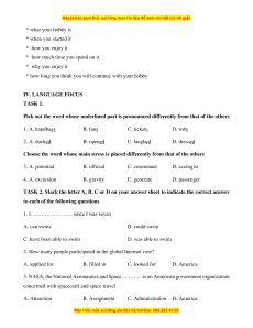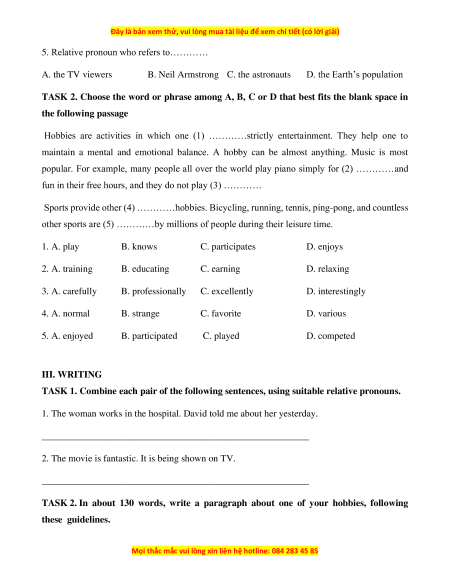 other sports are (5) …………by millions of people during their leisure time. 1. A. play B. knows C. participates D. enjoys 2. A. training B. educating C. earning D. relaxing 3. A. carefully B. professionally C. excellently D. interestingly 4. A. normal B. strange C. favorite D. various 5. A. enjoyed B. participated C. played D. competed III. WRITING