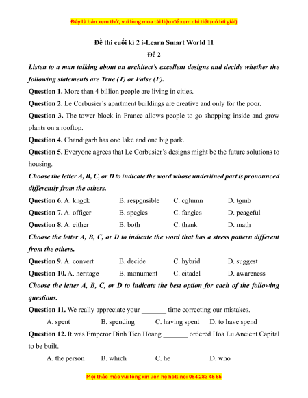 Đề thi cuối kì 2 Tiếng Anh 11 Ilearn smart world (Đề 2 kèm file nghe)