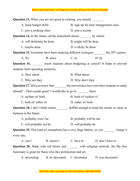 Question 14. In the future, all the household chores _______ by robots. A. will definitely be done B. might will be done C. maybe done D. is likely be done