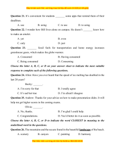 Question 24. Allen: Have you ever heard that the speed of ice melting has doubled in the last 20 years? Becky: _______. A. I’m sorry for that B. I totally agree C. It’s sad but true D. I’m afraid I disagree