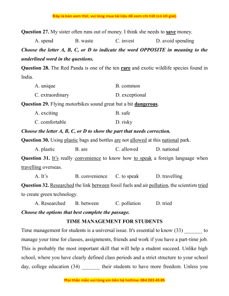 Question 27. My sister often runs out of money. I think she needs to save money. A. spend B. waste C. invest D. avoid spending