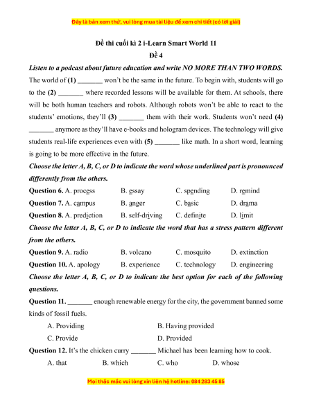 Đề thi cuối kì 2 Tiếng Anh 11 Ilearn smart world (Đề 4 kèm file nghe)