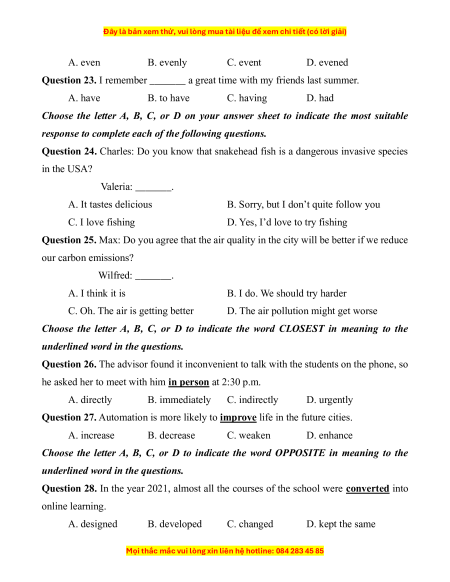 Question 28. In the year 2021, almost all the courses of the school were converted into online learning. A. designed B. developed C. changed D. kept the same