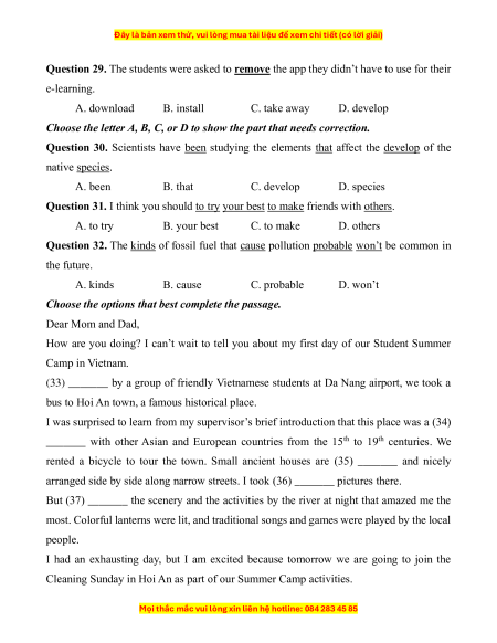 Question 30. Scientists have been studying the elements that affect the develop of the native species. A. been B. that C. develop D. species