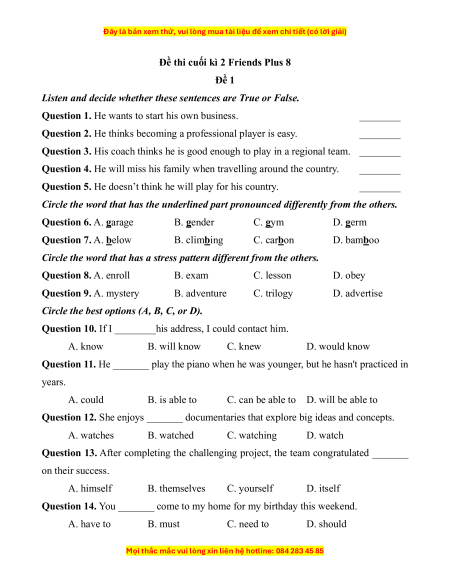 Đề thi cuối kì 2 Friends Plus 8 Đề 1