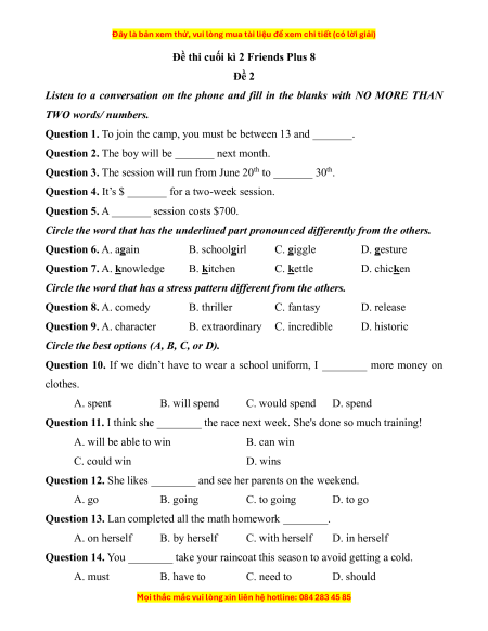 Đề thi cuối kì 2 Tiếng Anh 8 Friends Plus (Đề 2 kèm file nghe)