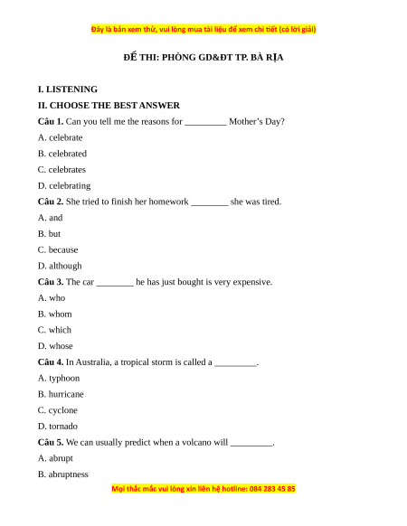 ĐỀ THI: PHÒNG GD&ĐT TP. BÀ R A Ị I. LISTENING