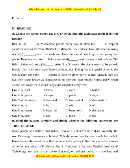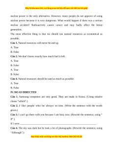Câu 4. Natural resources should be used as much as possible. A. True B. False IV. DO AS DIRECTED