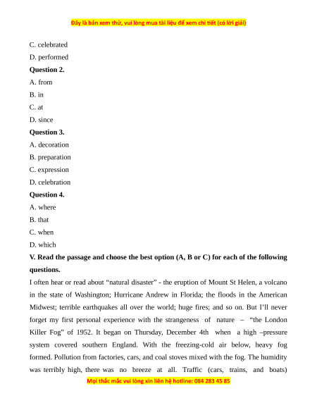 C. celebrated D. performed Question 2. A. from B. in C. at D. since Question 3. A. decoration B. preparation C. expression D. celebration Question 4. A. where B. that C. when D. which