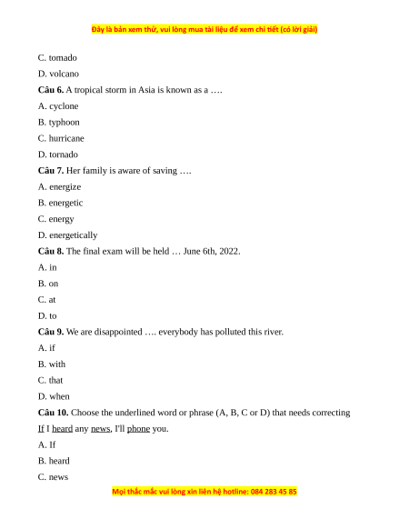 Câu 6. A tropical storm in Asia is known as a …. A. cyclone B. typhoon C. hurricane D. tornado