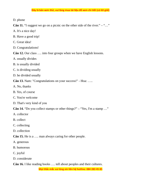 Câu 11. “I suggest we go on a picnic on the other side of the river.” – “…” A. It's a nice day! B. Have a good trip! C. Great idea! D. Congratulations!