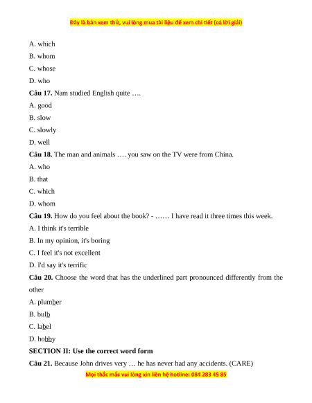 Câu 18. The man and animals …. you saw on the TV were from China. A. who B. that C. which D. whom