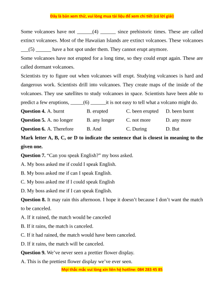predict a few eruptions, _____(6) ______it is not easy to tell what a volcano might do. Question 4. A. burnt B. erupted C. been erupted D. been burnt
