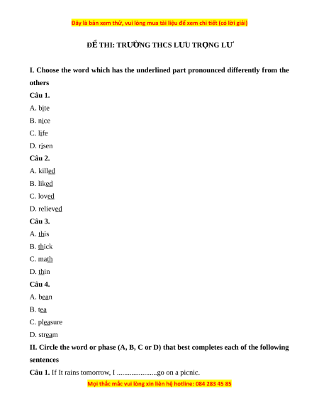 I. Choose the word which has the underlined part pronounced differently from the others Câu 1. A. bite B. nice C. life D. risen Câu 2. A. killed B. liked C. loved D. relieved Câu 3. A. this B. thick C. math D. thin Câu 4. A. bean B. tea C. pleasure D. stream