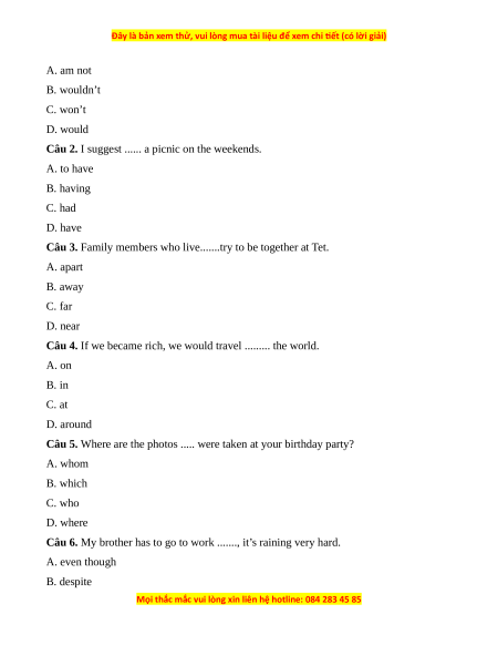 Câu 3. Family members who live.......try to be together at Tet. A. apart B. away C. far D. near