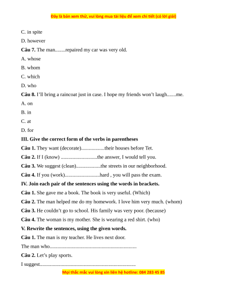 Câu 7. The man........repaired my car was very old. A. whose B. whom C. which D. who