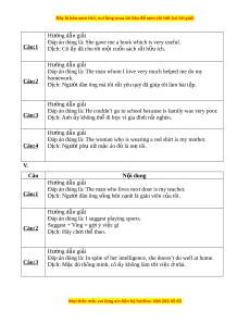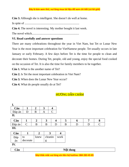 Câu 4. What do people usually do at Tet? HƯỚNG D N Ẫ CH M Ấ I. Câu 1 2 3 4 Đáp án D B A C II. Câu 1 2 3 4 5 6 7 8 Đáp án C B B D B D D C III. Câu 1 2 3 4 Đáp to knew cleanin work án decorate g IV. Câu N i ộ dung