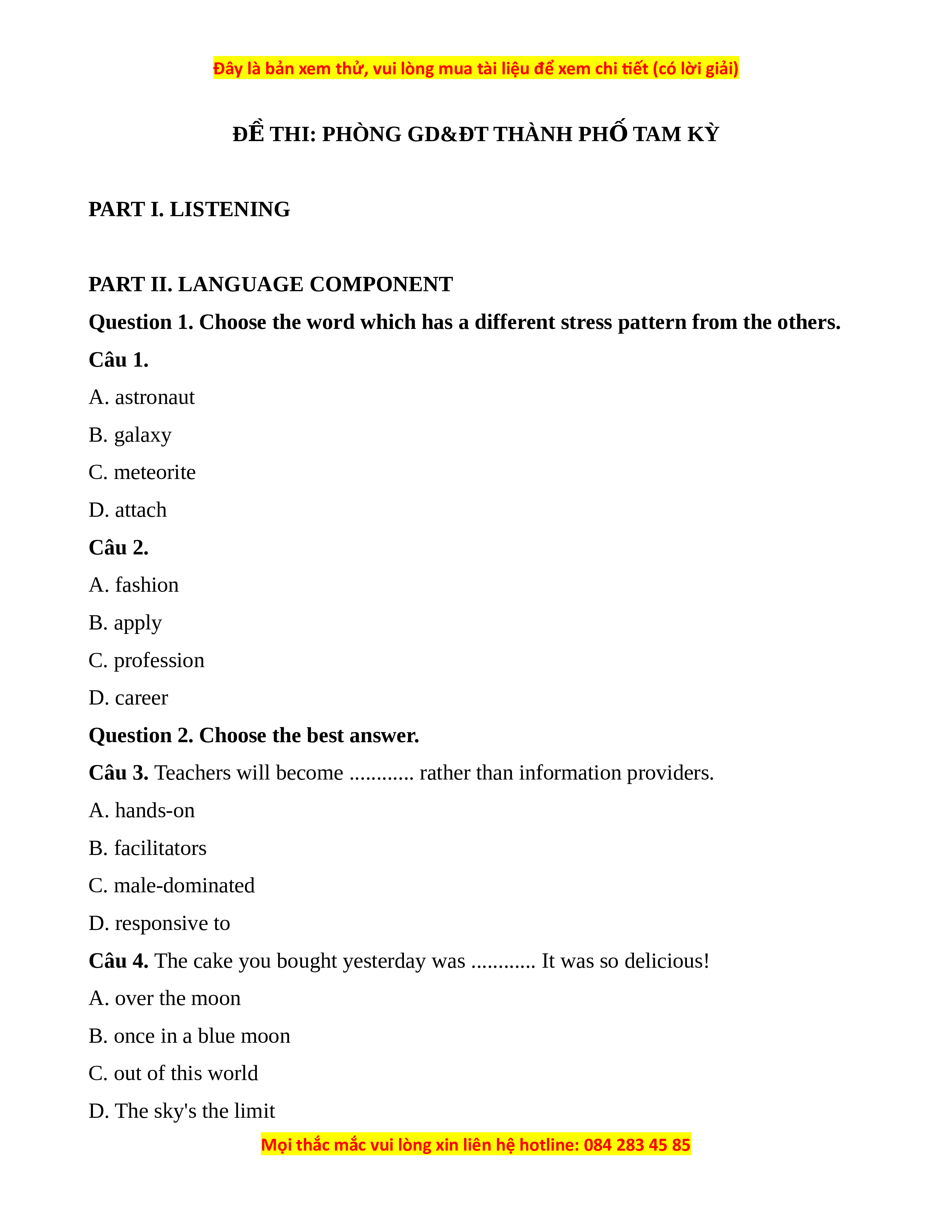 ĐỀ THI: PHÒNG GD&ĐT THÀNH PH Ố TAM KỲ PART I. LISTENING