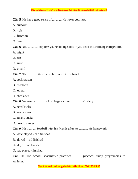 Câu 6. You ............ improve your cooking skills if you enter this cooking competition. A. might B. can C. must D. should
