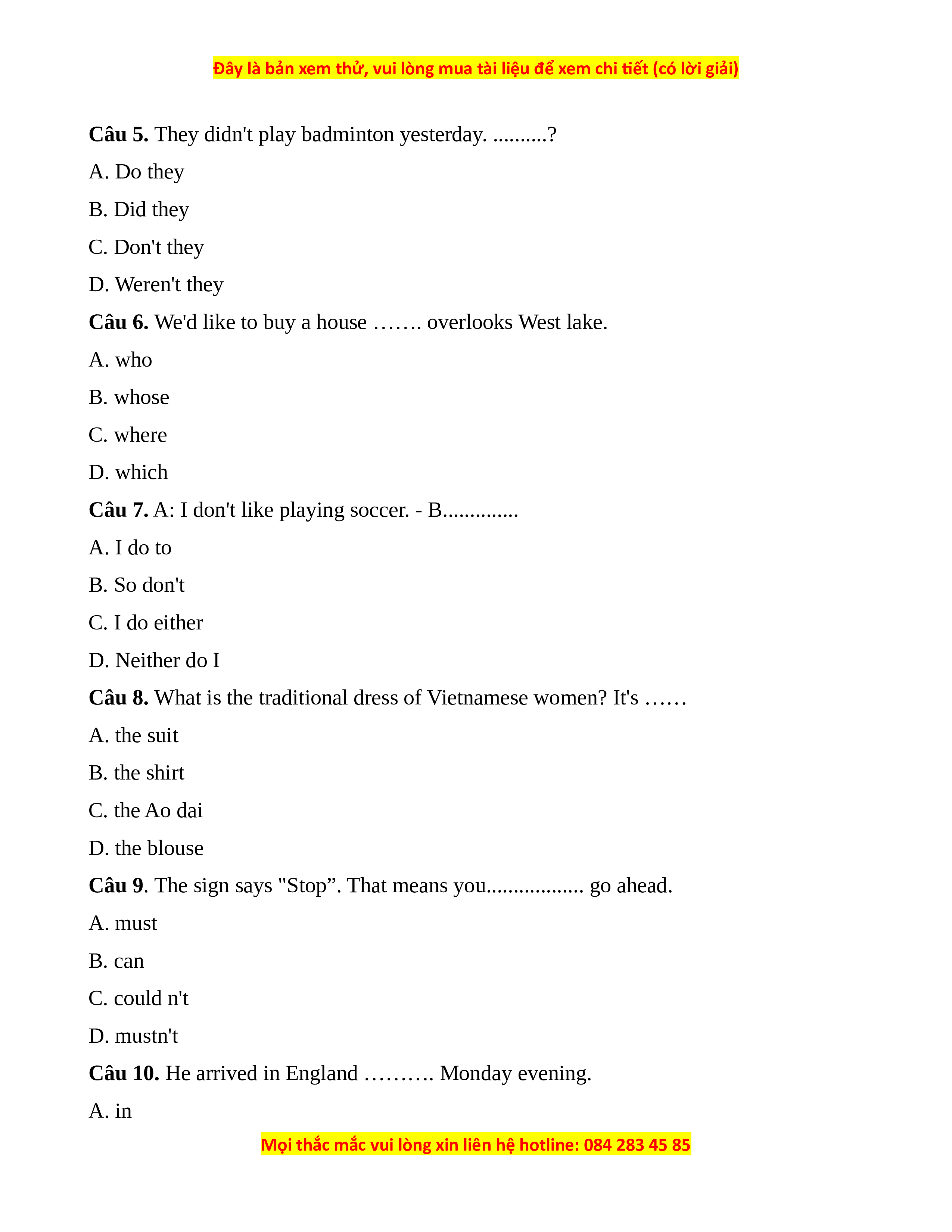 Câu 7. A: I don't like playing soccer. - B.............. A. I do to B. So don't C. I do either D. Neither do I
