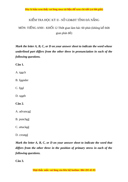Đây là bản xem th , vu ử i lòng mua tài li u ệ đ xe ể m chi ti t ế (có l i ờ gi i ả ) KIỂM TRA H C Ọ KỲ II - S G Ở D&ĐT T N Ỉ H ĐÀ N N Ẵ G MÔN: TI N Ế G ANH - KH I Ố 12 Th i