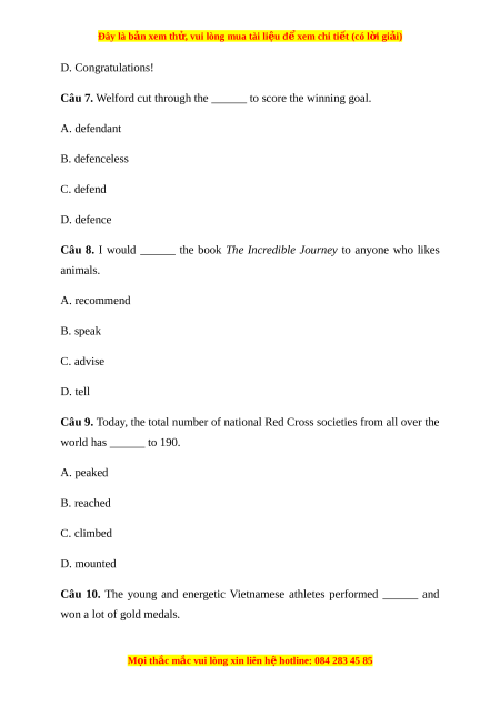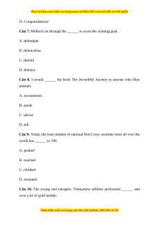 Câu 9. Today, the total number of national Red Cross societies from all over the world has ______ to 190. A. peaked B. reached C. climbed D. mounted